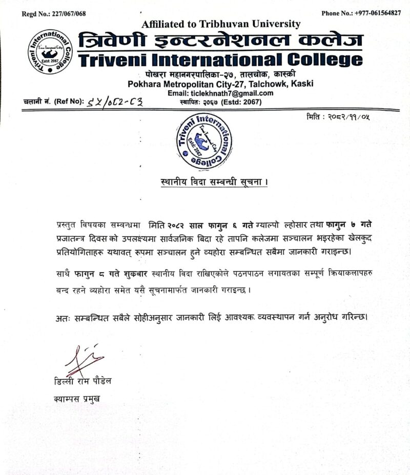 NTHMC द्वारा आयोजित National Level Capital Market Quiz-2026 मा त्रिवेणी इन्टरनेशनल कलेजमा BBS तहमा अध्ययनरत विद्यार्थीहरु विनय रिमाल र सागर तिवारी सहभागि भई तृतीय स्थान हासिल गर्न सफल भएकोमा हार्दिक बधाई ।