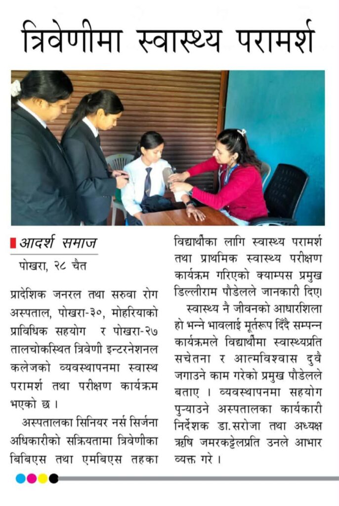प्रादेशिक जनरल तथा सरुवा रोग अस्पताल, पोखरा–३० मोहरियाकी सिनियर नर्स सिर्जना अधिकारीको सक्रियतामा त्रिवेणी इन्टरनेशनल कलेजका BBS तथा MBS तहमा अध्ययनरत विद्यार्थीहरूका लागि स्वास्थ्य परामर्श तथा प्राथमिक स्वास्थ्य परीक्षण कार्यक्रम सफलतापूर्वक सम्पन्न भएको छ।