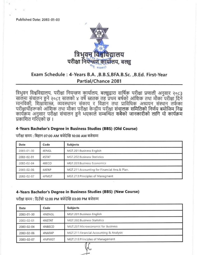 Exam Schedule: 4 Years First Year B.B.S, B.Sc., B.Ed., B.A., & BFA (Partial & Chance)083/01/03