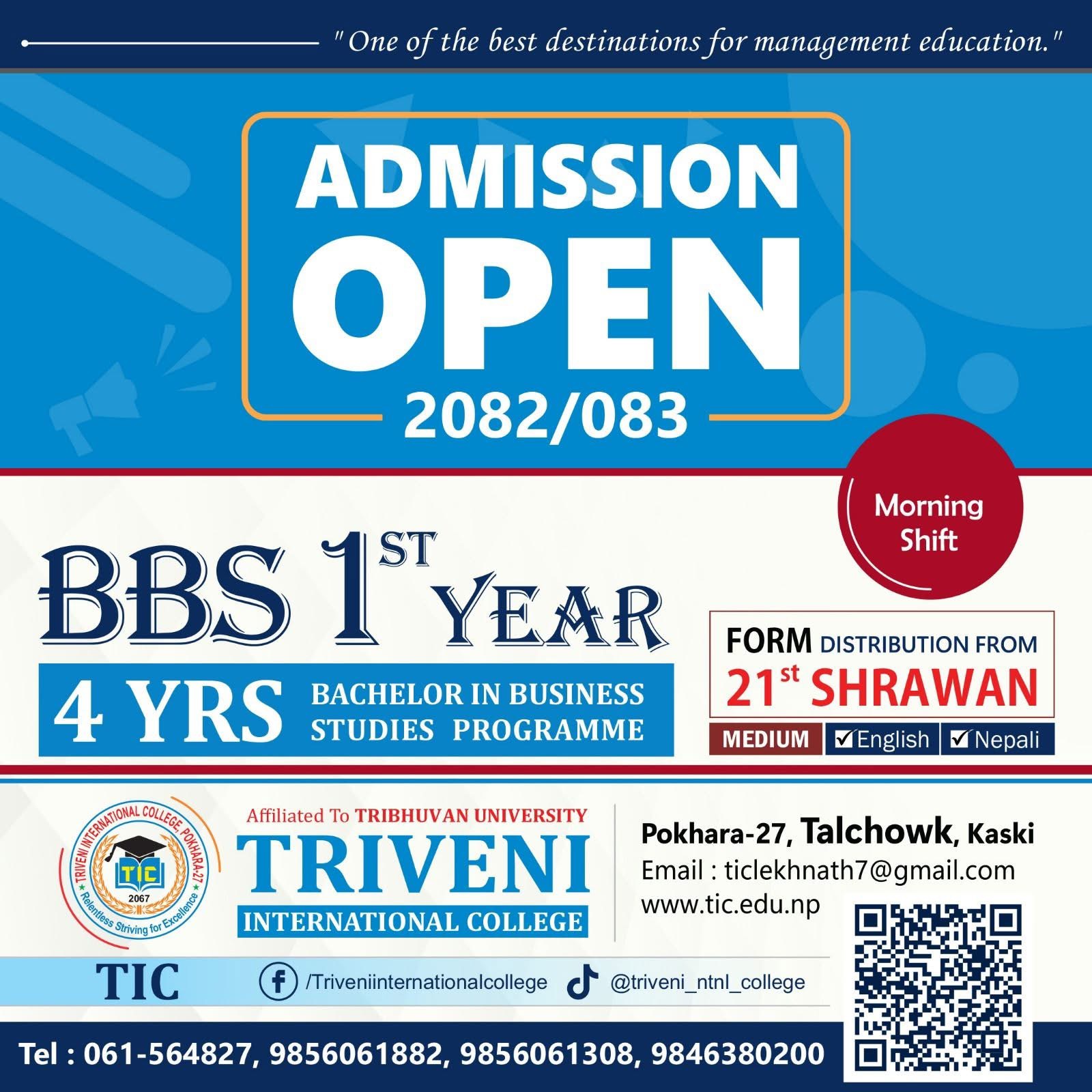 Triveni International College पोखरा -२७, तालचोकमा BBS प्रथम वर्षका लागि भर्ना खुलेको जानकारी गराइन्छ।